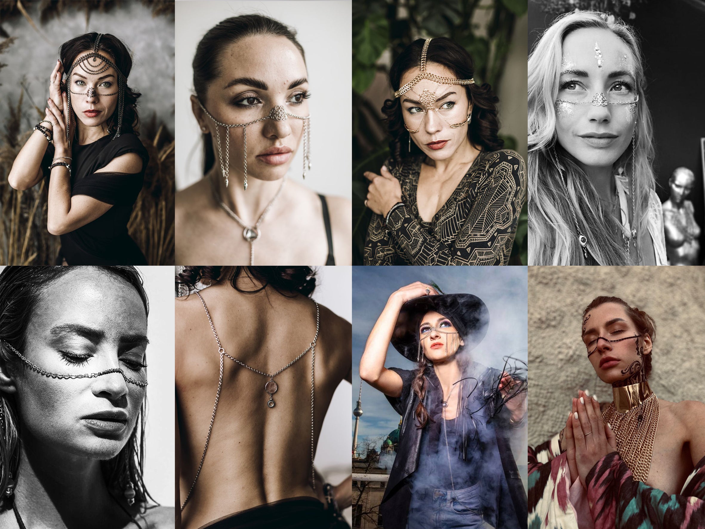 My face chains (like a piece of lace that smoothly wraps around your nose and ears) are stunning and timeless eye catchers.